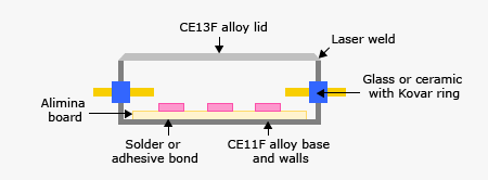 As the controlled expansion (CE) alloys melt below the temperature of most conventional glasses used for direct sealing of feedthroughs into Kovar* or steel packages it is normal to use either glass or ceramic insulated feedthroughs in a Kovar ring or ferrule. These can be soldered into the machined and plated package as in normal aluminium package technology. In addition, explosively bonded feedthroughs can be directly welded into packages in alloys Osprey® CE17F, CE13F or CE11F.